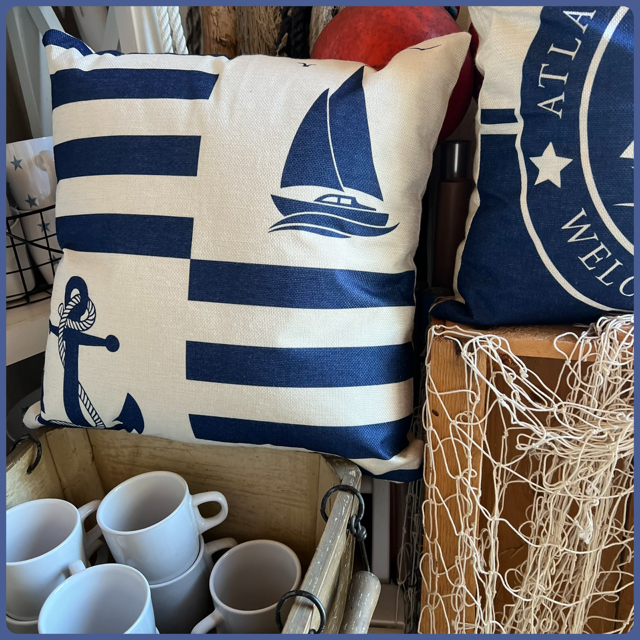 Blåvit kudde med marint tryck, innerkudde medföljer. Storlek ca 40x40.